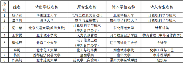 此次公示信息显示,8名学生中有7名都是从北京的高校转入其他省份高校。大部分学生的原专业和转入专业有变化,其中一位学生拟从金融学类专业转入临床医学类专业。