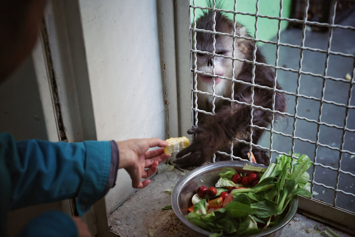 “烈焰红唇”是滇金丝猴的显著标志,饲养员王海春记得2007年刚来动物园工作时,“阿贵”正值壮年,它的小脸儿总是粉扑扑的,配上红唇,又精神又漂亮。它还很机灵,见到笼外换上普通服装的饲养员也能一眼认出来,张大嘴呲着牙以示友好。如今,它一身灰黑色的毛发已经不再有光泽,年事已高使它的自洁能力变差,周身散发出一股不太清爽的气味。