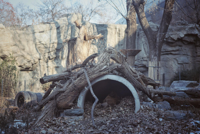 棕熊“灰灰”位于室外的“窝”中垫着厚实松软的落叶,它睡在里面,看起来十分舒服。“棕熊步入老年的一个特征就是不再发情了。”饲养员邢海健说,以往开春儿,棕熊会躁动地走来走去,但去年春天,“灰灰”没有发情。