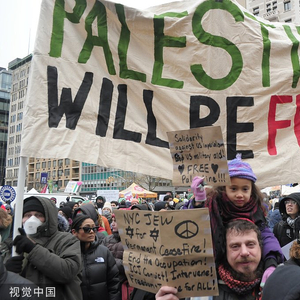 当地时间1月15日,马丁·路德·金纪念日当天,美国数千名示威者在曼哈顿举行游行,要求巴以永久停火 图片来源:视觉中国