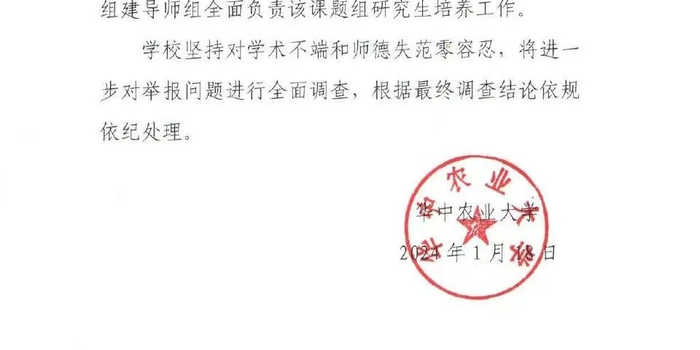 16日当晚,华中农业大学动科动医学院在官网发布说明称,学院关注到网上关于我院教师黄某某涉嫌学术不端等问题的举报信息,立即成立工作专班,启动调查程序,对学术不端行为零容忍。19日凌晨,华中农业大学做出情况通报,称学校学术道德委员会在已调查材料中发现所反映的实验图片、数据、结果等方面问题基本属实,初步认定存在学术不端行为。即日起,校方已停止黄某若校内所有职务和工作,组建导师组全面负责该课题组研究生培养工作。