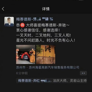 网传截图显示,一名称为“梅赛德斯-奔驰”的网友发布朋友圈称,恭祝大师喜提梅赛德斯奔驰,感谢信任,感谢选择,并配发了两名僧人在奔驰车前的合影。