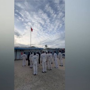 当地时间1月29日,中国驻瑙鲁使馆复馆小组在设立于中国港湾公司瑙鲁项目部的临时办公地点举行升旗仪式。复馆小组全体成员和港湾公司瑙鲁项目部代表参加。这是时隔19年,五星红旗再次在瑙鲁升起。(总台记者 王聪)