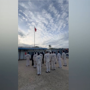 当地时间1月29日,中国驻瑙鲁使馆复馆小组在设立于中国港湾公司瑙鲁项目部的临时办公地点举行升国旗仪式。复馆小组全体成员和港湾公司瑙鲁项目部代表参加。这是时隔19年,五星红旗再次在瑙鲁升起。
