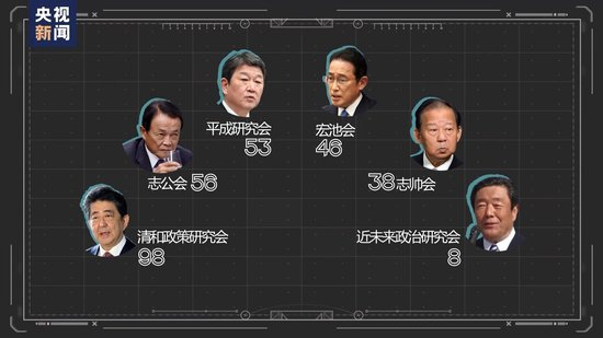 长期以来,“派阀政治”一直被视为日本自民党政治的代名词,此前,自民党内共有六大派阀:“安倍派”,清和政策研究会,有98名议员;“麻生派”,志公会,有56名议员;“茂木派”,平成研究会,有53名议员;“岸田派”,宏池会,有46名议员;“二阶派”,志帅会,有38名议员;“森山派”,近未来政治研究会,有8名议员;自民党内的无派阀议员仅有79名。