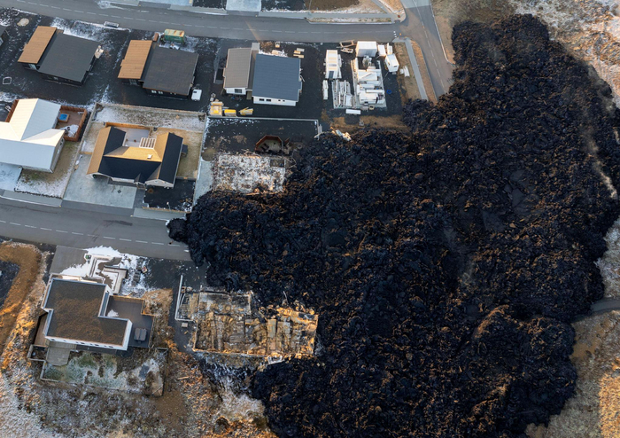 当地时间2024年1月17日,冰岛雷克雅内斯半岛格林达维克镇附近,当地一座火山喷发,多座房屋被蔓延至小镇的岩浆烧毁。图/IC photo