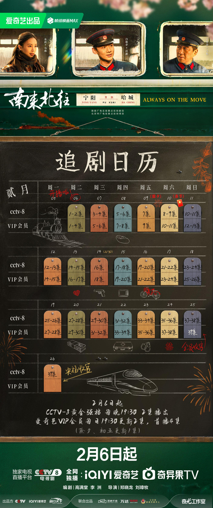 新京报讯 2月5日,电视剧《南来北往》发布追剧日历。该剧共39集,于2月6日晚在CCTV-8和爱奇艺开播,将于2月25日迎来会员收官,2月26日央视收官。官方微博配文称:“旅客朋友们请注意,由宁阳开往哈城方向的南来北往号列车马上就要进站了,请接好你们的追剧日历准备上车:2月6日起,CCTV-8黄金强档每天19:30更新2集,爱奇艺全网独播,VIP会员每日更新2集,首播4集,除夕、初五更新1集,春节不断更,欢乐过大年!”
