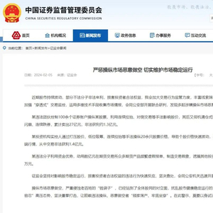 2月5日,中国证券监督管理委员会发文称,近期股市持续波动,部分不法分子非法牟利,损害投资者合法权益,我会加大交易行为监管力度,丰富线索筛查手段,统筹安排专项核查,加强“穿透式”交易监控,运用多维技术手段收集市场情报,会同公安部开展联合研判,发现多起涉嫌操纵市场恶意做空案件。