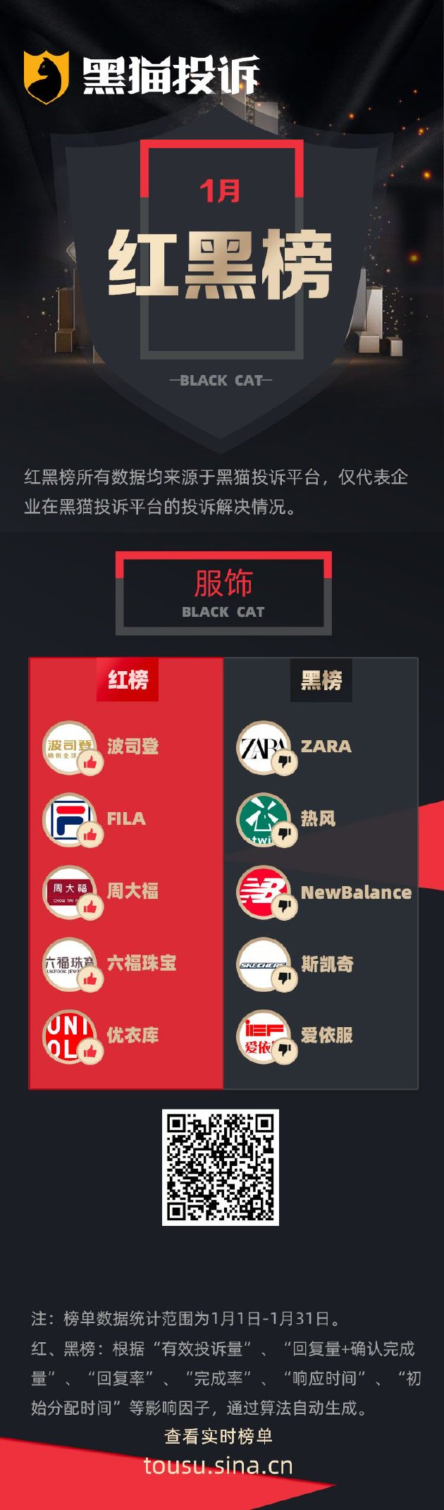 1月黑猫投诉服饰领域红黑榜:ZARA以次充好质量差