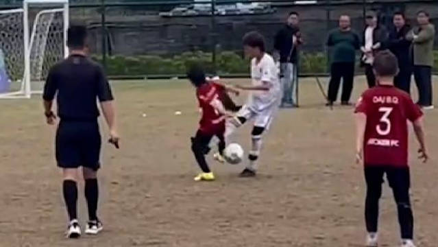一名小球员在比赛中被踢倒在地。 视频截图