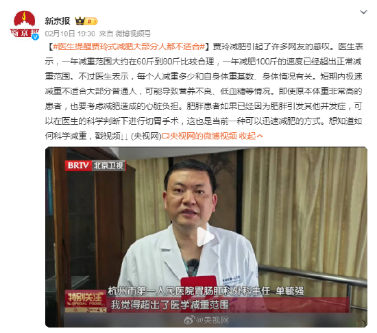 [#医生提醒贾玲式减肥大部分人都不适合#]贾玲减肥引起了许多网友的感叹。医生表示,一年减重范围大约在60斤到80斤比较合理,一年减肥100斤的速度已经超出正常减重范围。不过医生表示,每个人减重多少和自身体重基数、身体情况有关。短期内极速减重不适合大部分普通人,可能导致营养不良、低血糖等情况。即使原本体重非常高的患者,也要考虑减肥造成的心脏负担。肥胖患者如果已经因为肥胖引发其他并发症,可以在医生的科学判断下进行切胃手术,这也是当前一种可以迅速减肥的方式。想知道如何科学减重,戳视频↓↓