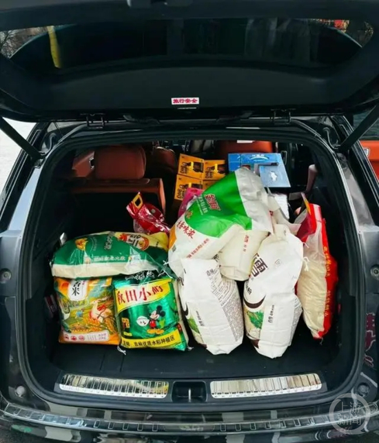辽宁网友小曾晒出自己的后备箱,里面堆满了东北产的好几大袋大米和面粉。