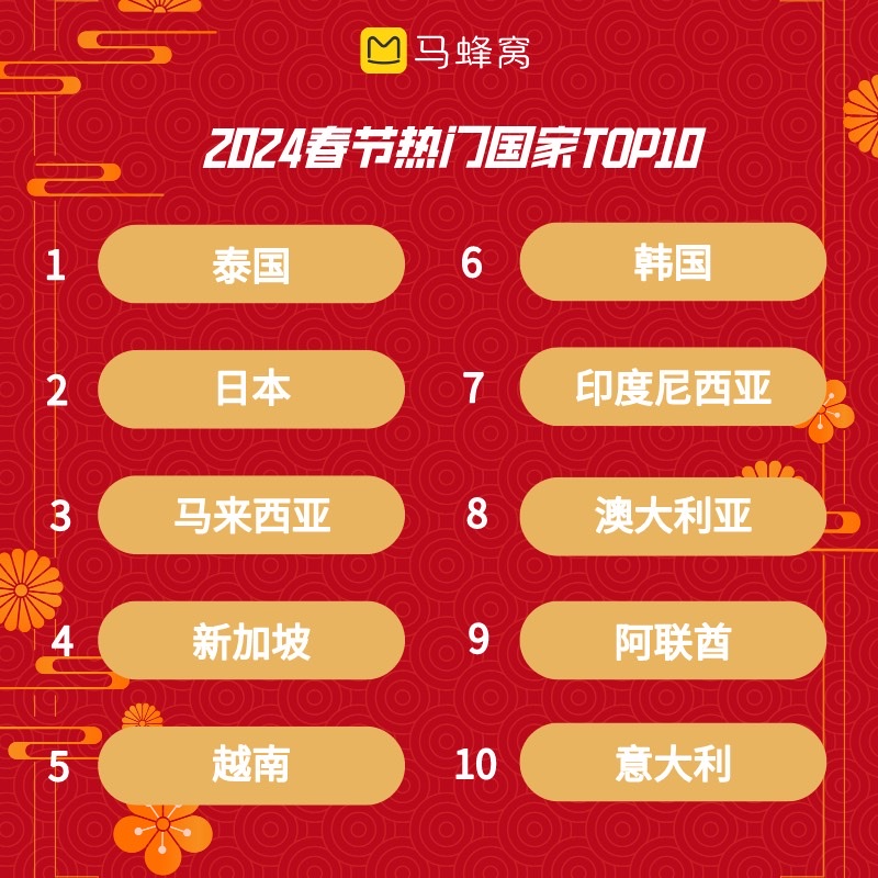 国内旅游市场“热情洋溢”,国外旅游市场同样“如火如荼”,热度超过去年十一假期。马蜂窝大数据显示,加入免签行列的“新马泰”跻身热门国家前五。春节期间马蜂窝境外攻略群的问题绝大多数来自已经在旅途中的用户,当地餐厅推荐、特色伴手礼购买地点、城市之间小交通、当地新玩法等一些行中会遇到的问题是他们关注的重点。