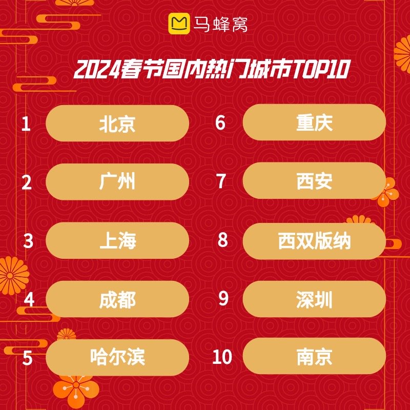 其中年味儿十足的北京登上春节假期热门城市榜首,除了故宫、颐和园、环球影城等传统热门景区外,龙潭公园庙会、地坛庙会、八大处庙会等几大新年庙会在今年“盛况空前”,引爆民俗体验游。同样火爆的还有北京“首届温榆千灯会”,在千盏自贡非遗彩灯的加持下,温榆河公园每日游人如织,热度上涨150%。春晚“国风”分会场对传统文化的精彩演绎让本就热门的西安冲上热搜,热度大涨400%,大唐不夜城、城墙灯会、大唐芙蓉园是游客在西安体验国风文化的首选。