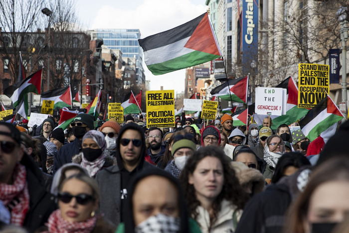 当地时间2024年2月17日,美国华盛顿特区,民众举行抗议游行,要求巴以立即停火,并要求美国停止支持以色列。图/IC photo