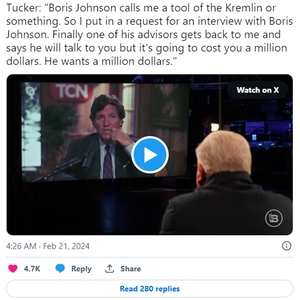 (观察者网讯)在结束对俄罗斯的访问后,美国知名记者塔克·卡尔森于2月20日首次公开接受采访。卡尔森透露,曾因采访普京而对他进行猛烈攻击的英国前首相约翰逊表示,要采访约翰逊需先支付100万美元。