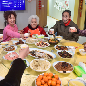 ▲老人及家属在一起吃“团圆饭”。图/新华社