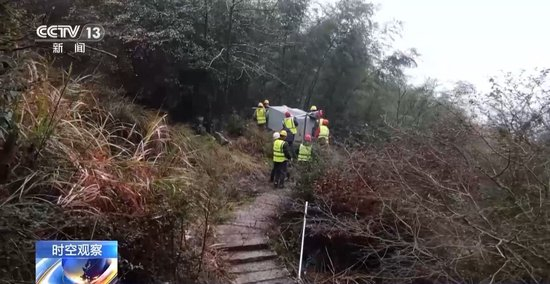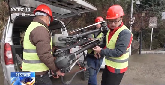将第一批组件成功运往目的地后,无人机很快又飞回来,准备再次运输。往返几次下来,大部分设备都成功运往高山上的目的地。然而有些大家伙还是需要人工作业。虽然是正午时分,但高山上的气温仍然逼近零摄氏度,面对近60度倾角的山坡,江涛他们不得不停下脚步。