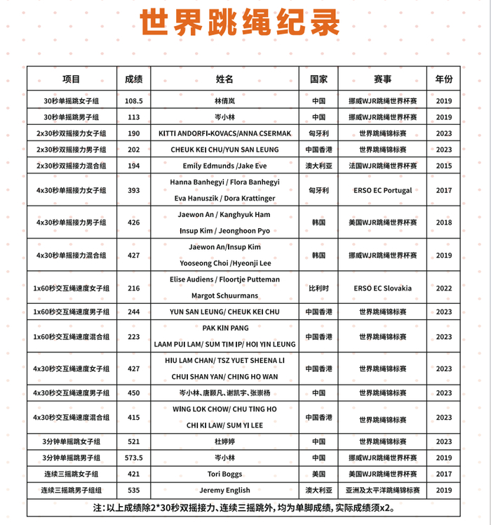 在全国跳绳推广委员会发布的世界跳绳纪录统计中,总计18项,由中国运动员保持的有10项。(注:WJR为World Jump Rope世界跳绳联盟简称。)