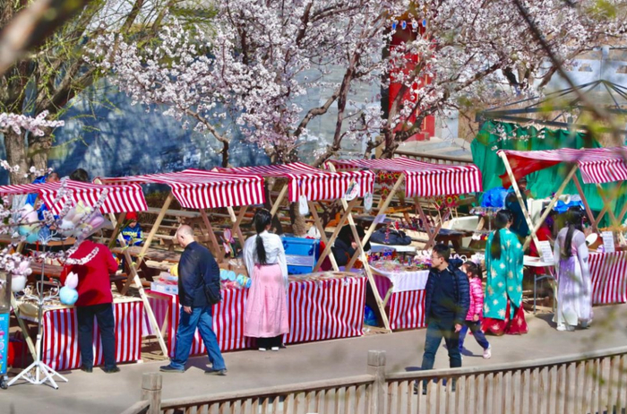 各种古风民俗商品,团扇,发簪,各类民间手工艺品等,还有各种传统小吃,摊位围绕着主路,于旁边的杏花相呼应,组成了杏花大集!