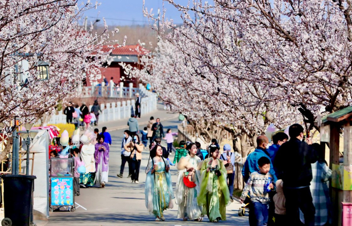园区主题以杏花和古风为主,为了让古风氛围更加生动浓郁,我们邀请了古装达人游园,游客可以一起拍照合影,同时也是园区内一抹靓丽的景色。