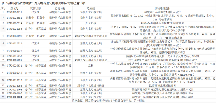 根据国家药物临床试验登记与信息公示平台数据,目前以“硫酸阿托品滴眼液”为药物名登记的相关临床试验已达到16项,较2022年增加了45%。其中至少5项已进入III期临床试验。企业方面,除了兴齐眼药外,欧康维视生物(01477.HK)、兆科眼科(06622.SH)、博瑞制药、齐鲁制药、莎普爱思(603168.SH)、杭州赫尔斯科技、艾尔健康眼药等均有布局。