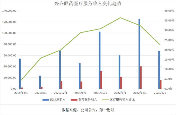 据了解,早在2019年1月,兴齐眼药就获得0.01%阿托品滴眼液的医疗机构制剂注册批件,并依托“医疗机构制剂+互联网医院”这一特殊商业模式形成医疗服务收入,在近年来快速增长,占该公司营收比最高达到36%以上,并且毛利率水平超过80%。2022年7月,新出台的互联网医院新政禁止院内制剂通过互联网医院渠道销售,2022年三季度至今,兴齐眼药医疗服务收入快速回落。