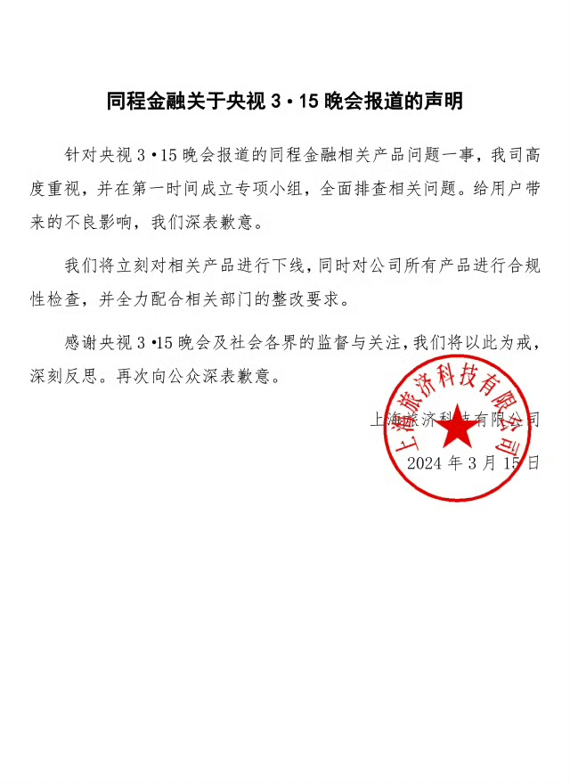 3月15日晚间,同程金融在微博发布关于央视3•15晚会报道的声明称,“针对央视3•15晚会报道的同程金融相关产品问题一事,我司高度重视,并在第一时间成立专项小组,全面排查相关问题。给用户带来的不良影响,我们深表歉意。”