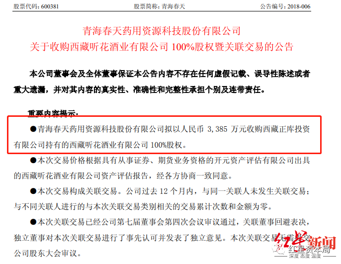 随后,张雪峰又把目光投向了白酒。2018年3月8日,斥资3385万元收购西藏听花酒业。不过,根据青海春天2018年年报显示,西藏听花酒业亏损6546.34万元,营收仅为2519.62万元。