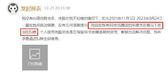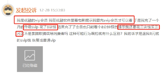 有消费者向黑猫平台反馈称:在优酷app观看看电影被提示需要充svip会员才可以看;可升级会员后还是只能看8分钟预告,提示还要花3元购买正片才能观看,充值页面涉嫌虚假宣传。同时平台上还有其他消费者投诉优酷会员扣费问题,投诉原因主要集中于未经提醒自动续费、会员订阅退订难等。