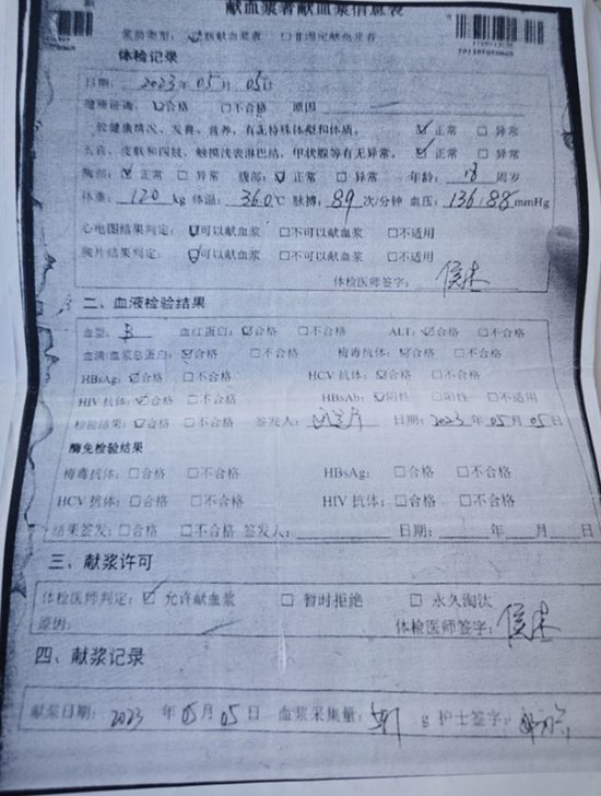 赵志杰在第二天整理儿子遗物时发现一摞厚厚的医院检查单,上面显示赵伟“心悸原因待查,全血细胞减少、重度贫血”,疑出现造血功能障碍。他又从儿子手机聊天记录中得知,2023年5月份开始,赵伟几乎每月都前往“忻州血浆站”献血浆,他怀疑儿子的死与长期连续的有偿捐献血浆有关系。