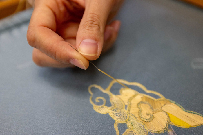 “非遗专业每年有一百多个毕业生,我会在其中选择几个收徒,作为京绣第八代代表性传承人。”何洪杰目前有五个徒弟,她也有自己的一套收徒标准:首先要人品好,其次要能吃苦,最重要的是,手艺要好,要能把京绣技艺传承下去。
