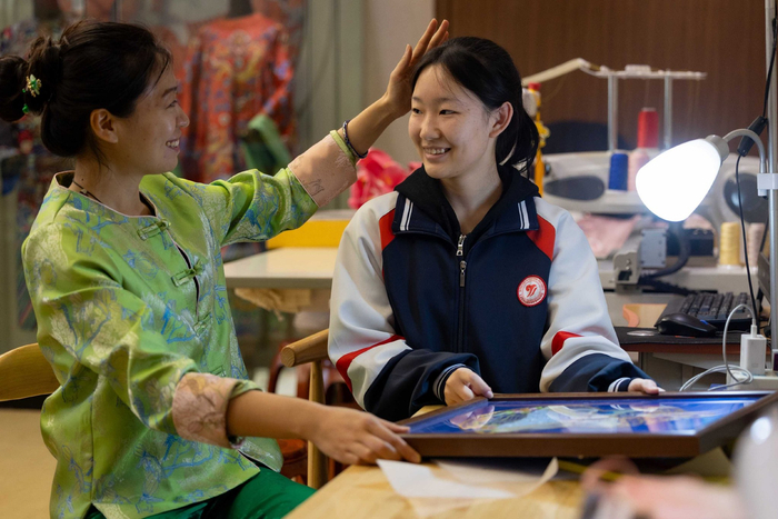 感念于各位工艺美术大师的鼎力相助,何洪杰更加坚定了继续走下去的心。同时来自学生的回馈,也让她确定,她的付出是有意义的。有一位学生让她印象深刻,因为家庭原因刚进校的时候是“叛逆少女”,但何洪杰发现她酷酷的外表下对待绣活儿非常用心。“我问她愿不愿意加入工坊,她‘嗯’了一声。”后来,这个学生也正式成为了她的徒弟。