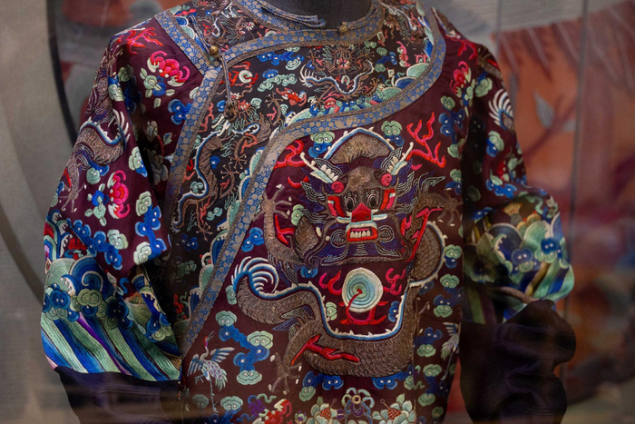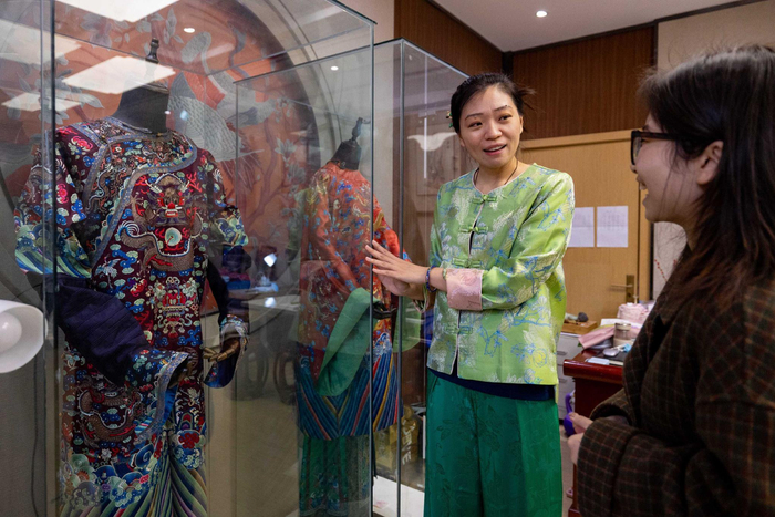 除去上课,何洪杰大部分时间都在“京绣工坊”,带领学生们完成一幅幅京绣作品。走进工坊,映入眼帘的是两套清代宫廷服饰,通体刺绣,色彩华美,“这是清代的老物件儿,五爪龙袍和吉服。”何洪杰说,她去年看了《逃出大英博物馆》,不忍心精美的文物流落海外,下定决心收藏了这两套吉服。工坊四周的墙上也挂满了绣品,“这个是我师爷李树堂大师的作品,这面墙这些都是清代的,有一品官员的补子,还有马面裙的图案……”何洪杰滔滔不绝地介绍自己收藏的精美绣品,“我工作了十二年,工资都用来买这些了。”