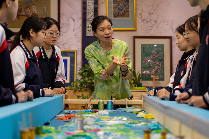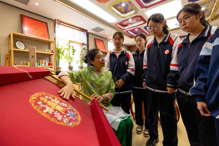 “走线要再柔和一些,每一针的运用要将头脑里想到的思路运用到指尖,这样才能心手合一,京绣艺术的魅力也在于此”。北京市丰台区职业教育中心学校的非遗教室里,京绣非遗传承人、该校教师何洪杰正在指导同学们进行京绣实操。教室的四周,摆满她从教期间自己收集和创作的京绣作品。置身其中,大家仿佛来到了艺术的世界。