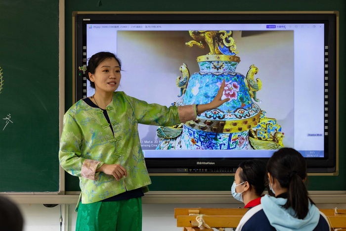 作为首家开设非遗专业的中职院校,没有先例可参考,非遗专业的老师们探索出了“双师”制的教学模式:校内老师+聘请非遗传承人大师来校指导,“大师手里的功夫都非常好,但是他不会讲。而我们的教师,可以将大师传授的技艺,转化为学生能够领悟的语言。两种学习模式相互补充,‘双师’的模式能够让孩子们感受到最原汁原味的非遗学艺的过程。”在工坊筹备初期,何洪杰和同事一个一个走访工艺美术大师,介绍学校的情况,希望大师能来给学生讲课。令她感动的是,一听说是给学生上课,没有一位大师拒绝。“景泰蓝工坊,我们邀请了国际工艺美术大师李佩卿、玉雕工坊邀请了福建省级工艺美术大师林建国,这些传承人和工艺美术大师,对于我们非遗专业的教学工作,给予了大力的支持。”何洪杰的师爷,京绣第五代代表性传承人李树堂大师,九十多岁的高龄也会拄着拐杖来学校里指导学生的京绣技巧,鼓励孩子们好好学习,将来把京绣技艺发扬光大。