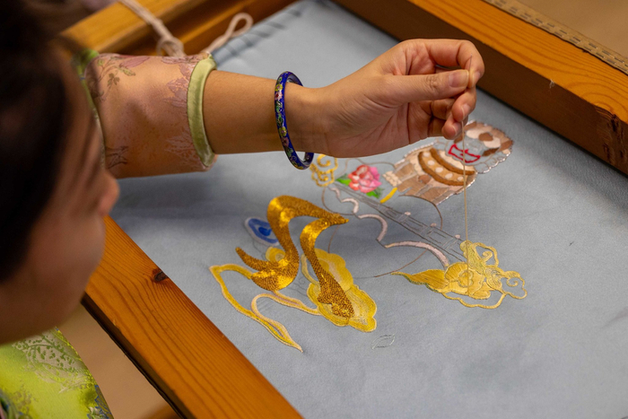 威严的龙、典雅的凤、吉祥的云……图必有意、纹必吉祥,起源于宫廷的京绣艺术在华美的纹样下具有考究的内涵。时代在变,非遗手艺也要与时俱进。在这里,何洪杰带领孩子们创新纹样,绣出天安门、浙江红船、桂林山水等祖国大好河山,为非遗传承融汇了时代的创新。