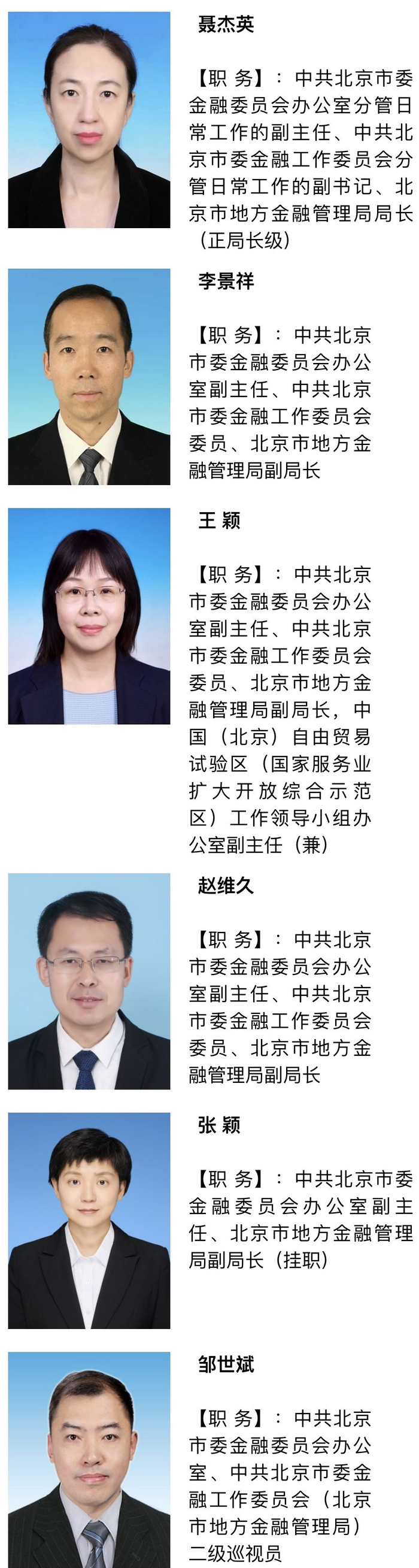 北京市委金融办官网“领导简介”一栏显示,各副主任信息公开如下: