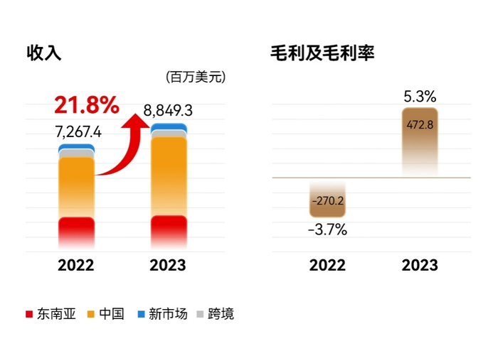 收入大幅增长的同时,2023年极兔在利润方面也有了较大突破,多项数据首次实现转正——全年毛利首次转正,达到4.73亿美元,经调整税息折旧及摊销前利润(EBITDA)也首次转正,达到1.47亿美元,其中,中国市场毛利和经调整EBITDA均首次转正。