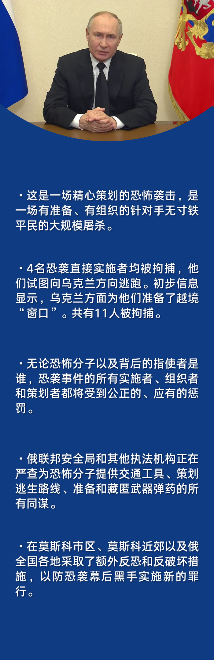 一图速览普京就莫斯科恐袭事件讲话要点 新华社 新华社官方账号 2024.03.2323:46 关注 俄罗斯总统普京23日就莫斯科近郊音乐厅恐怖袭击事件发表电视讲话时说,这起恐袭的实施者、组织者和策划者将受到严惩。他宣布3月24日为全国哀悼日。