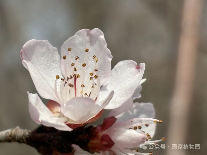 ▲授粉后的山桃花瓣和雄蕊花丝会逐渐变红