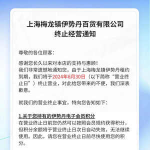 3月25日,梅龙镇伊势丹百货发布终止营业通知称,由于上海梅龙镇伊势丹租约到期,将于2024年6月30日终止营业。该通知也给出了伊势丹的会员积分处理方式。