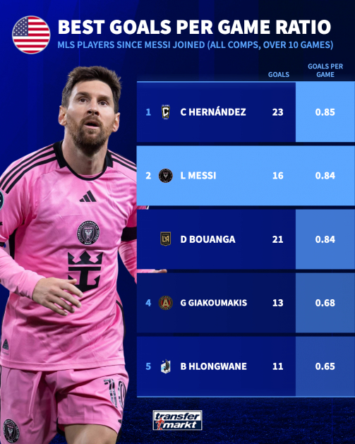 据数据统计,在19场比赛中,他为迈阿密国际队打进16球并提供了7次助攻,场均制造超过1球。本赛季,梅西代表迈阿密国际在各项赛事出场5次,打进5球并送出了2次助攻。