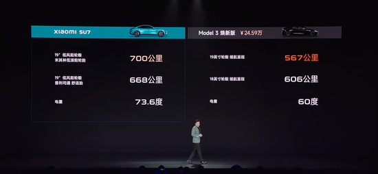 雷军表示,小米SU7全系长续航,在CLTC工况下标配起步续航为700公里。