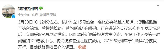 新京报讯 据上海铁路局杭州站官方微博通报,3月30日10时24分左右,杭州东站15号站台一名旅客突然跳入股道,沿着线路跑至站台端部,后横越线路向其他股道方向移动。正在进站的G7796次列车发现情况后,立即采取紧急制动措施,因距离较近同该旅客发生刮蹭。车站工作人员第一时间通知120急救中心,将受伤旅客送往医院救治。G7796次列车于11时47分恢复开行。目前铁路警方已介入调查。