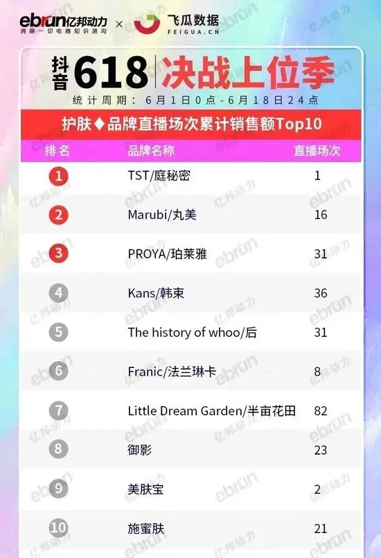 据亿邦动力和第三方数据机构飞瓜数据统计,2020年6月1日至6月18日期间,TST是所有护肤品类相关直播场次销售总金额排名第一的品牌,其次为丸美和珀莱雅。