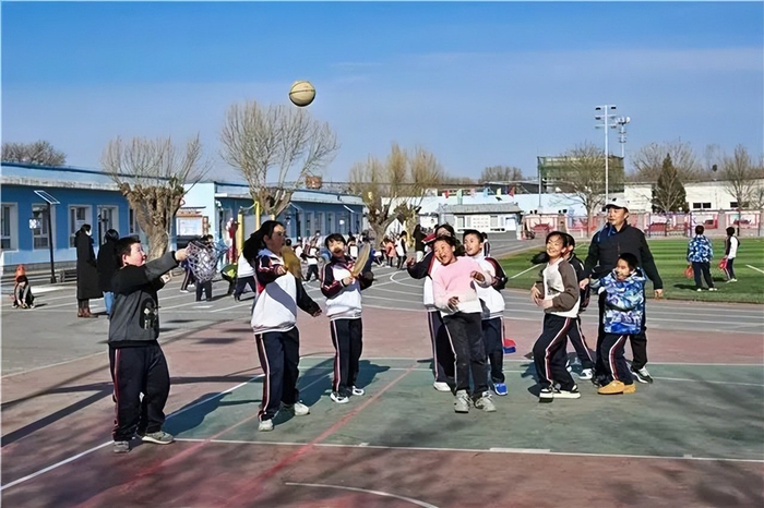 其中,高年级部主打“动静结合”,老师根据学生的身高特点,在操场上设置了高低篮球架,规划篮球场地,确保每个年级都有专属课间活动空间,可以自由开展篮球、长绳等运动项目。