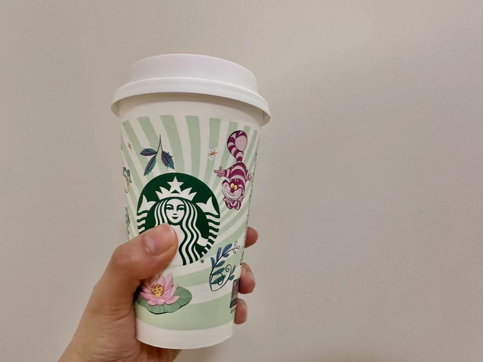 第一财经记者在星巴克小程序下单了一杯售价41元的“爱丽丝”睡莲风味拿铁,杯子特别绘制的《爱丽丝梦游仙境》主题纸杯,拿铁的上方是睡莲味的“云顶”,包含无花果粒。整体口感香甜醇厚。