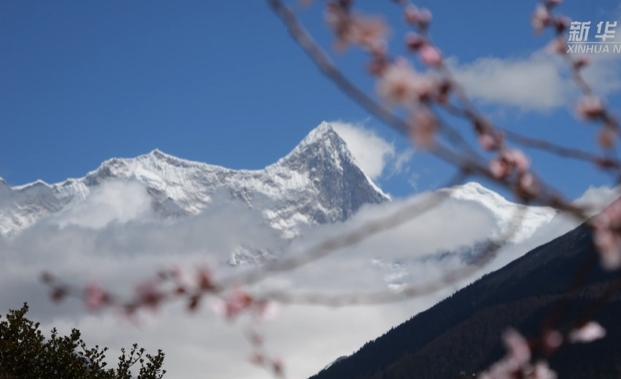 灿若云霞的桃花和洁白无瑕的雪山交织成一幅独特的雪域高原美景(3月30日摄)。新华社记者 丁增尼达 摄