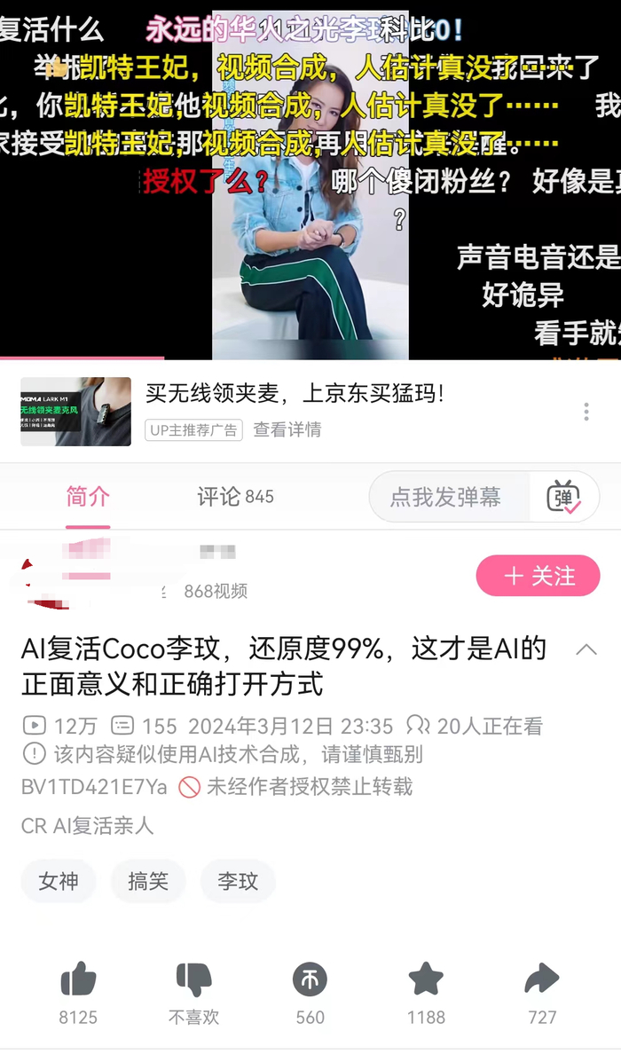 在B站,一则“AI复活coco李玟”的视频获得了12万次播放和845个评论,评论区内“授权了吗?”“等着收律师函吧”被顶到了前列。